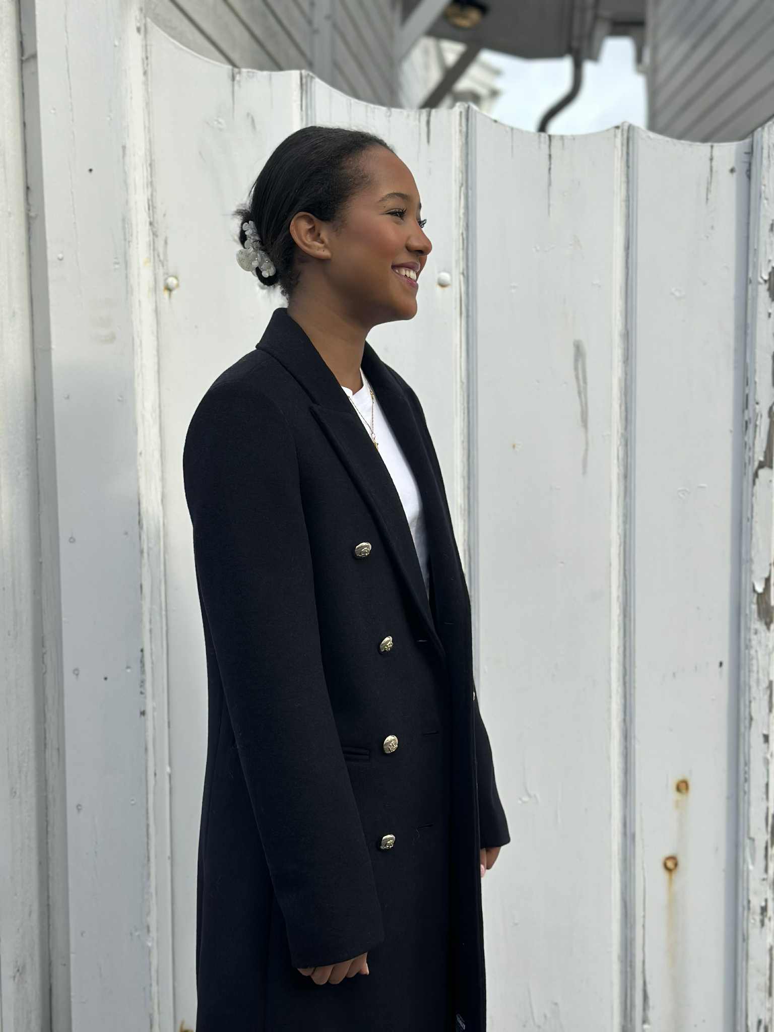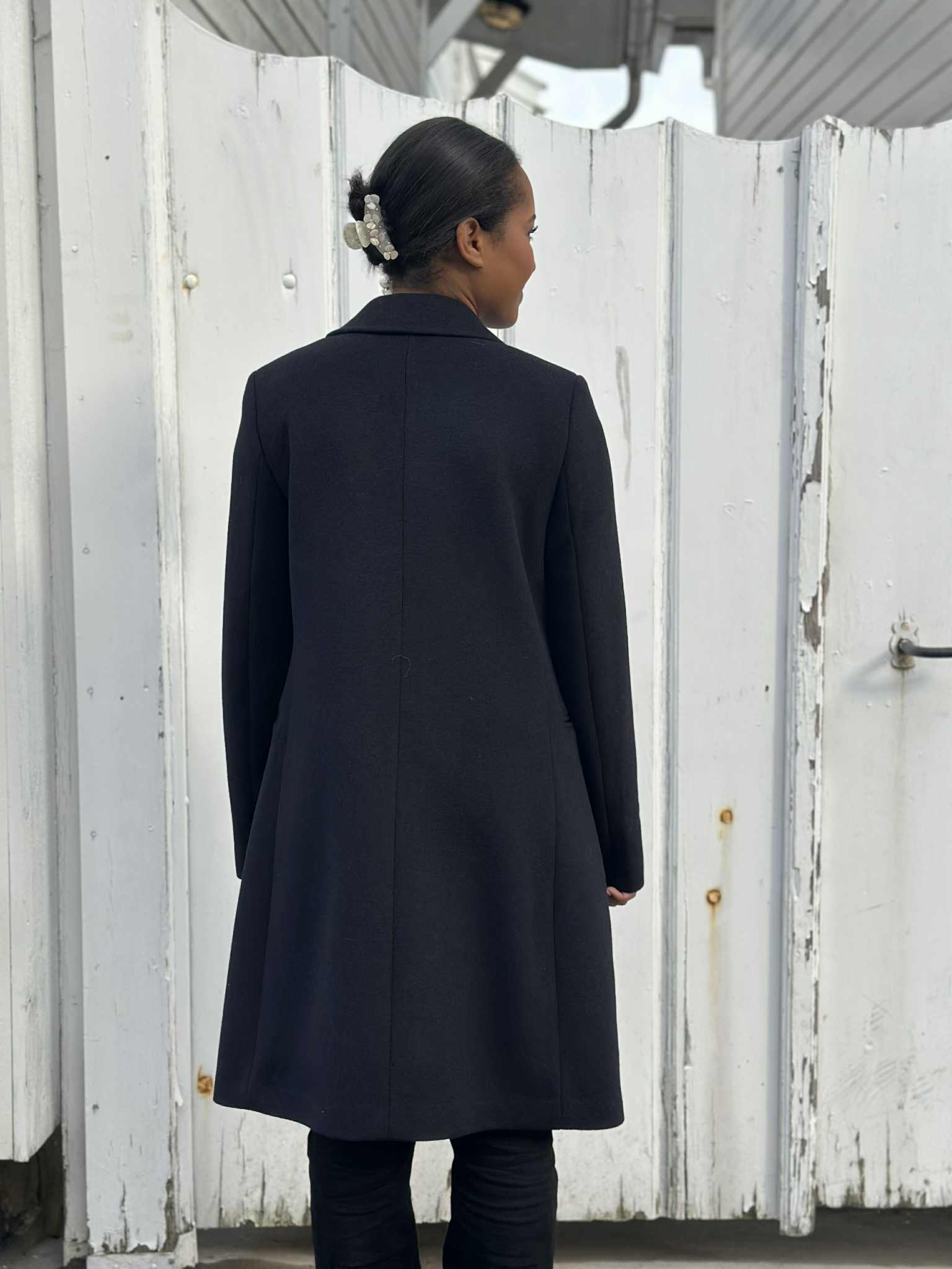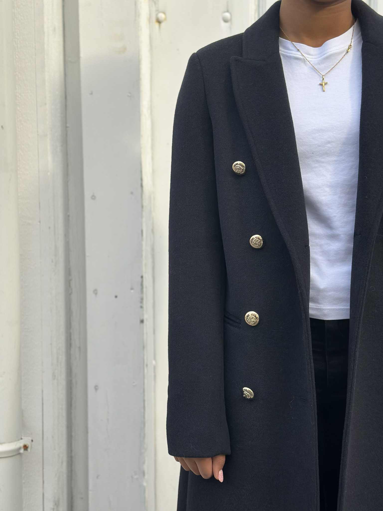 Denne dobbeltspente kåpen har et tidløst snitt med rette linjer og en rett passform som gir et raffinert uttrykk. Den er utstyrt med marineinspirerte gullknapper som gir et markant men sofistikert detaljpreg. Under kragen finnes et rødt kontraststoff som gir et subtilt, men stilsikkert løft.