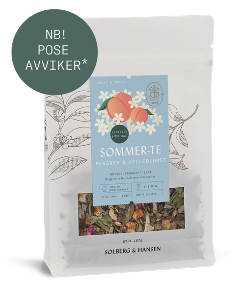 Ingredienser: Eplebiter, hibiskus, nypeskall, hvit te (Pai Mu Tan), bjørnebærblader, aroma, sitrusskall, hylleblomst, ferskenbiter (fersken, sukker).