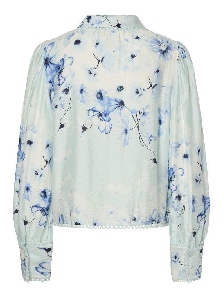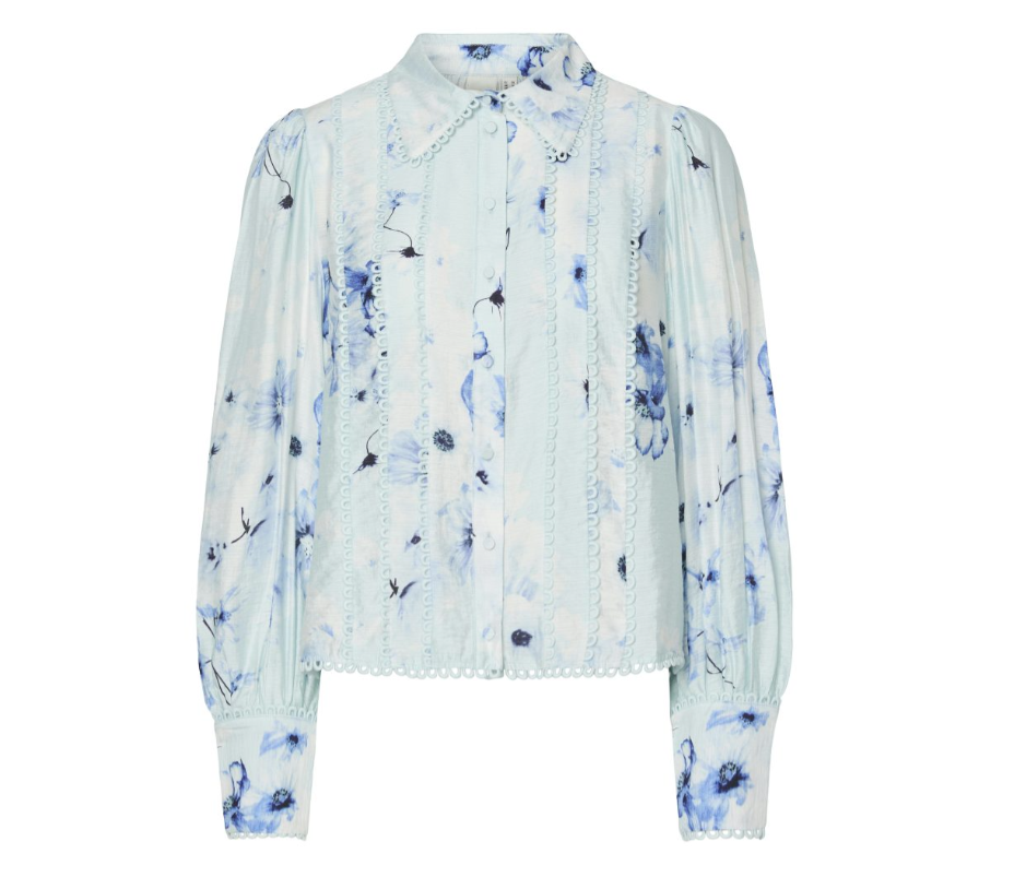 Farge og mønster: Halogen Blue – en delikat blåfarge med subtile blomsterbroderier og blondedetaljer langs knappestolpen, mansjettene og kragen.