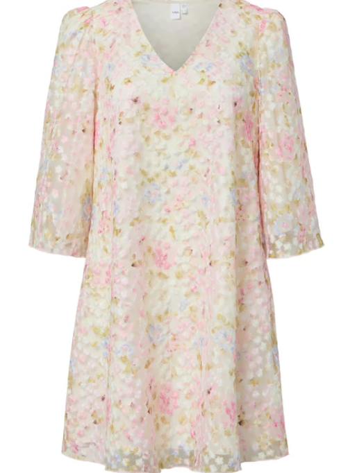Yasleanna 3/4 Dress fra Y.A.S er en romantisk, blomstret minikjole i rosa toner. Den feminine kjolen har V-hals og 3/4-ermer i lett klokkeform. Et delikat blondelag med små, teksturerte blomster gir dybde og glans, mens et mykt fôr i resirkulert polyester sørger for komfort og dekning. Regular fit med lett markert midje og et skjørt som faller elegant over kneet skaper et tidløst uttrykk. Perfekt som sommerkjole til bryllup, konfirmasjon og andre festlige anledninger – like fin med sandaler som med hæler.